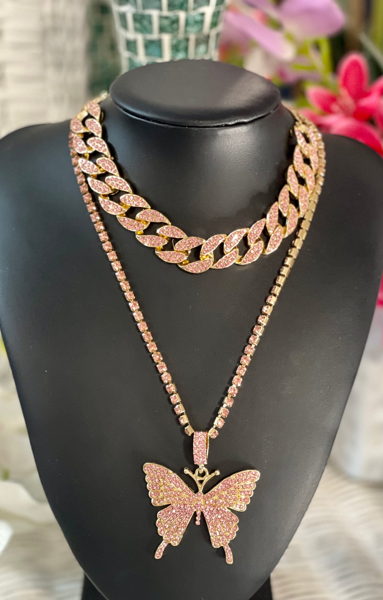 Two-piece Adjustable Chocker with rhinestones Pendant necklace with butterflies Rose Gold ICED OUT chain, bling butterflies, and a crystal choker necklace set. Cuban Link chocker set You can match the rhinestone chain necklace with your various styles of clothing to create various visual effects. You can also wear the big, shiny crystal butterfly pendant necklace itself. Wearing the Set will accentuate your overall clothes more since they are rhinestone-inlaid.